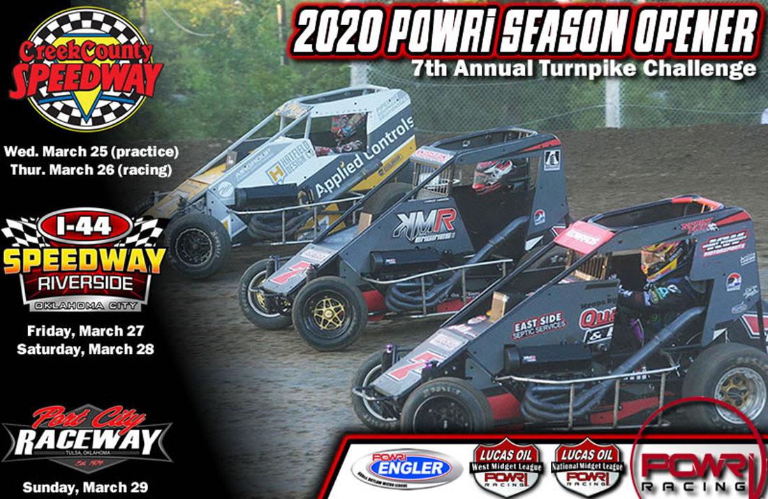 By POWRi Racing (Belleville, IL) -- Quickly morphing into a marquee event on the POWRi calendar, the Turnpike Challenge has experienced a meteoric rise to national prominence since debuting in 2014. A thrilling four-race swing throughout the "Sooner State," the 2020 TPC is only three weeks away from kick starting a new campaign for the POWRi Lucas Oil National / West Midgets and the POWRi Engler Machine & Tool Outlaw Micro League. From Creek County to I-44 to Port City, teams will be tested across four nights at three unique venues as they travel up and down the Oklahoma turnpike.